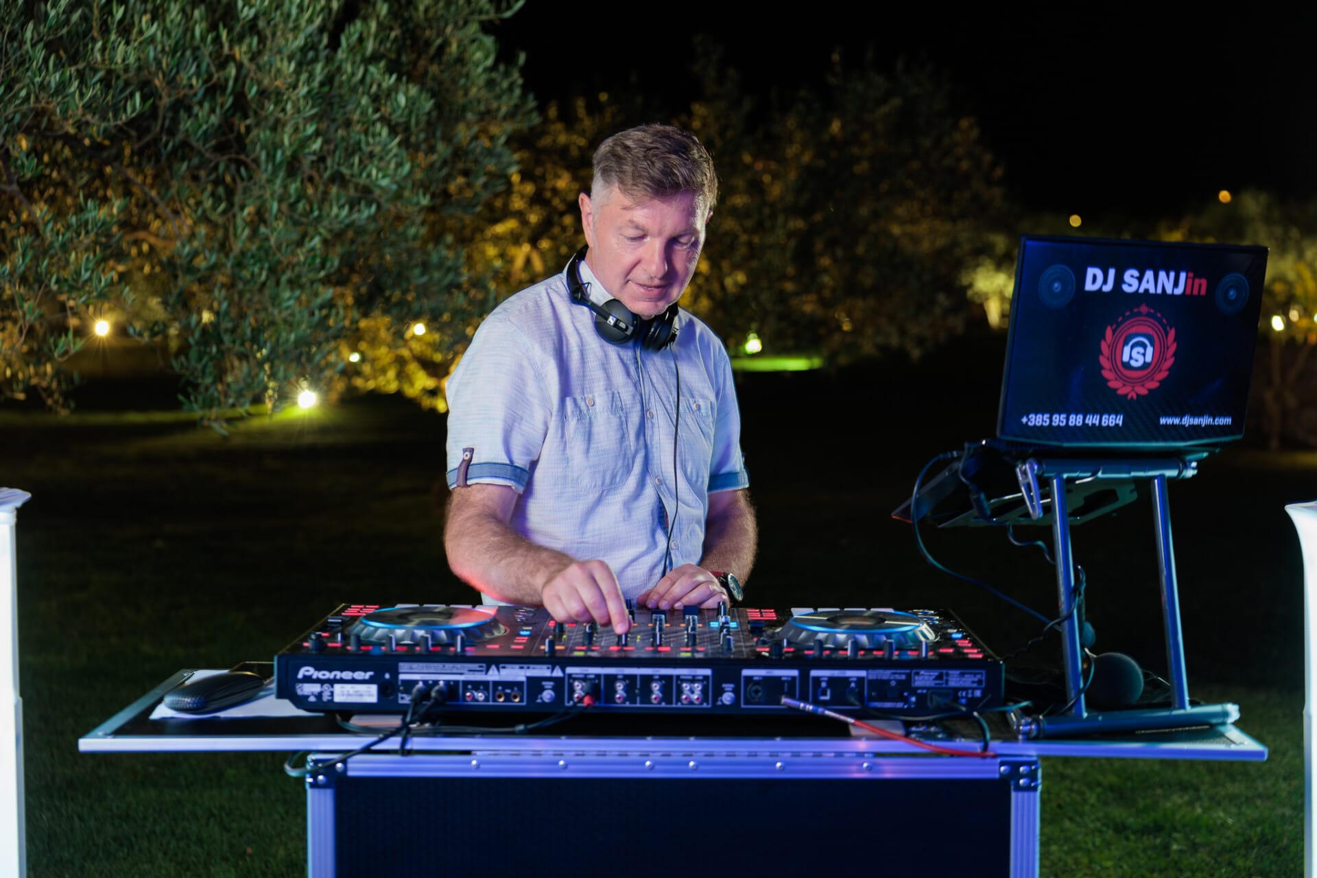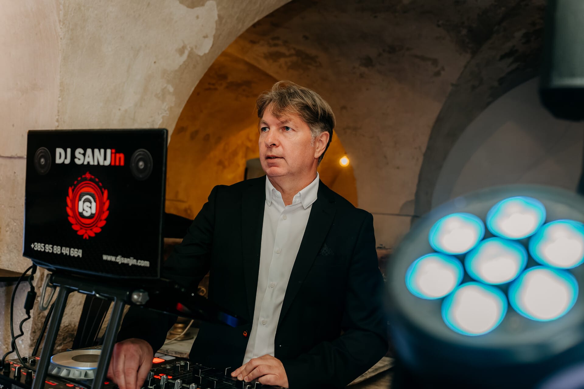 I own completely professional and high quality equipment (surround, lights, decorative lights, dance floor lights, laser effects, dry fog machine). If needed, there can also be a technician on the site who controls light effects and will meet all your wishes as well as colour the venue with light to improve the mood of guests and the entire event. Someone who owns high quality sound and light systems, has a vast knowledge and experience in music, is punctual and very responsible for the job – that is DJ SANJin.