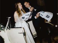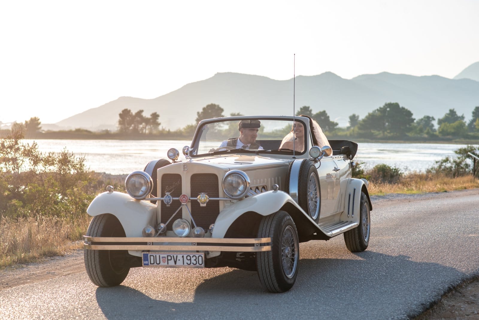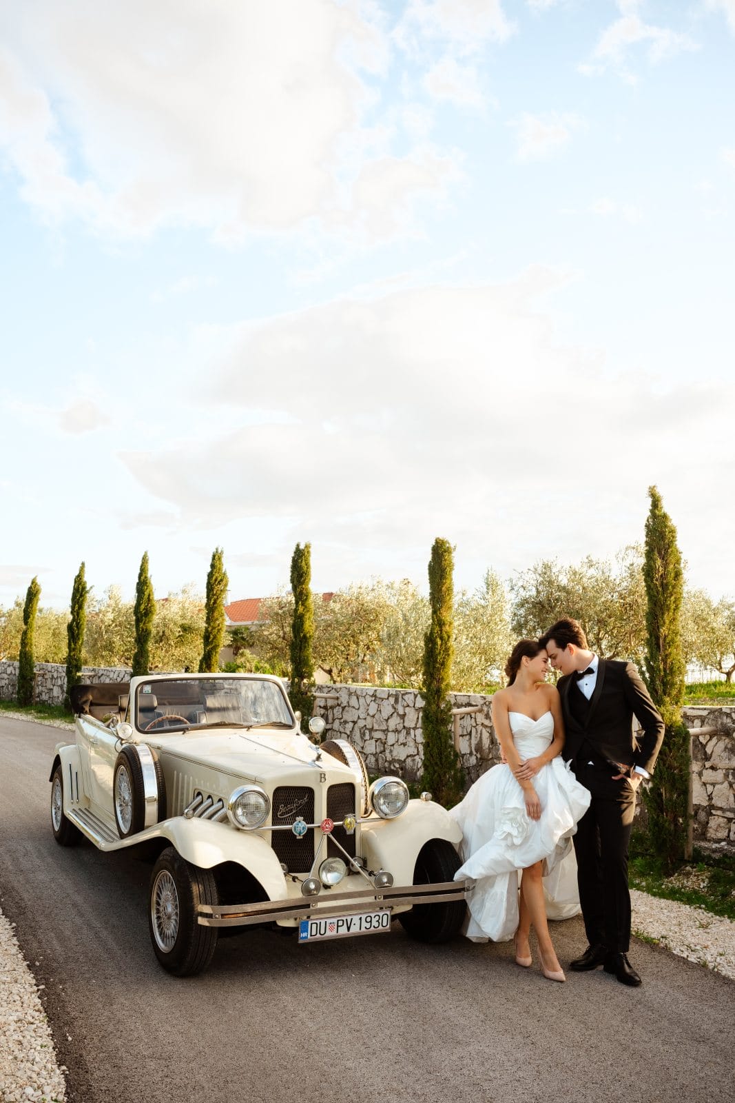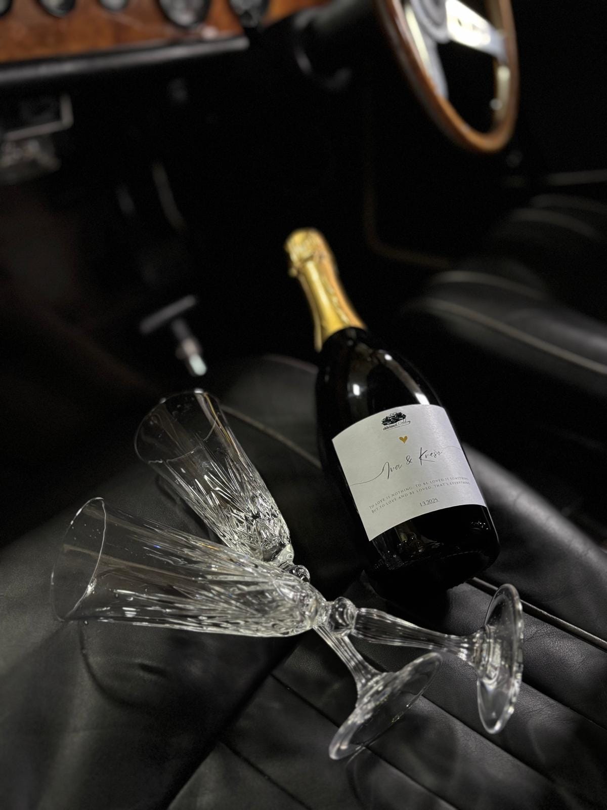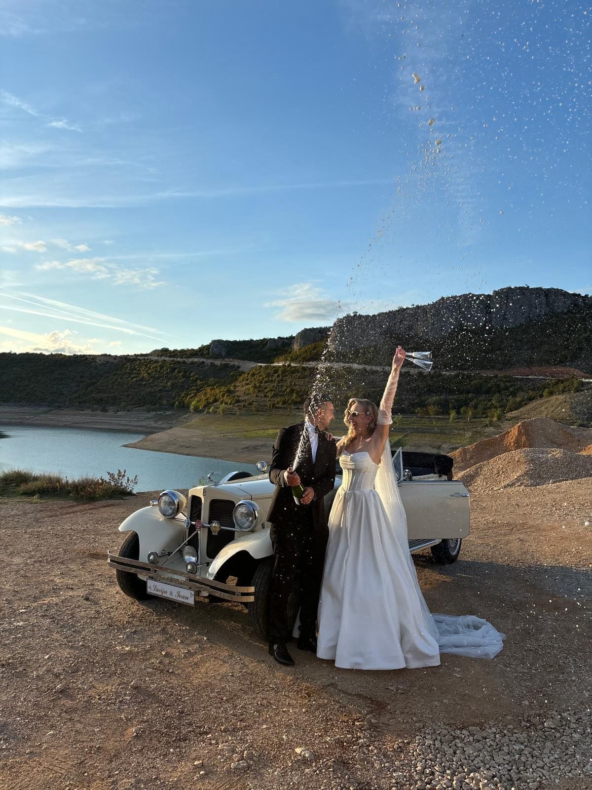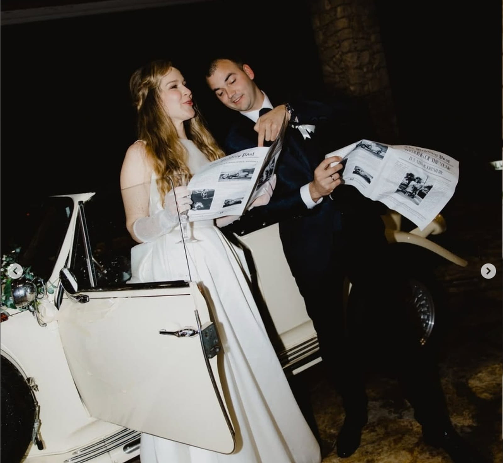 The car comes fully prepared with handcrafted, personalized decorations, custom license plates, a bottle of champagne with your names on it, and even your very own wedding newspaper — designed just for you.